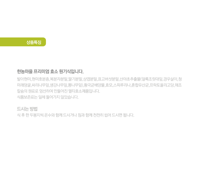 | 원재료명 및 함량 | 발아현미, 현미 호분층, 복분자 분말, 딸기분말, 상엽분말, 표고버섯분말, 산야초추출물(얼룩조릿대잎, 겨우살이, 청미래덩굴, 싸리나무잎, 생강나무잎, 뽕나무잎) 황국균배양물, 효모, 스피루리나, 혼합유산균, 프락토올리고당, 해조칼슘 |